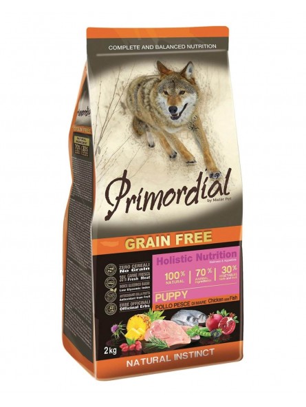 Kompletné krmivo pre šteňatá. Predkovia psov boli vlci, mäsožraví predátori. Vlčie mláďatá sa živili tým, čo svorka ukoristila, a zvykla si na stravu zloženú z čerstvého mäsa a rýb. Primordial s kuraťom a morskou rybou.