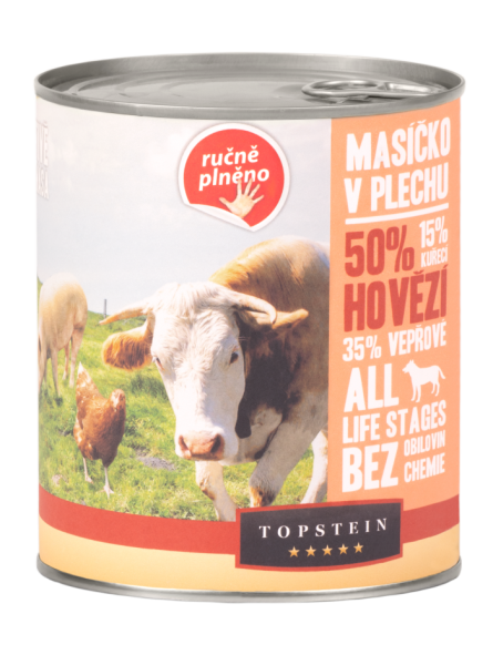 50 % hovädzie mäso, 35 % bravčové mäso, 15 % kuracie mäso